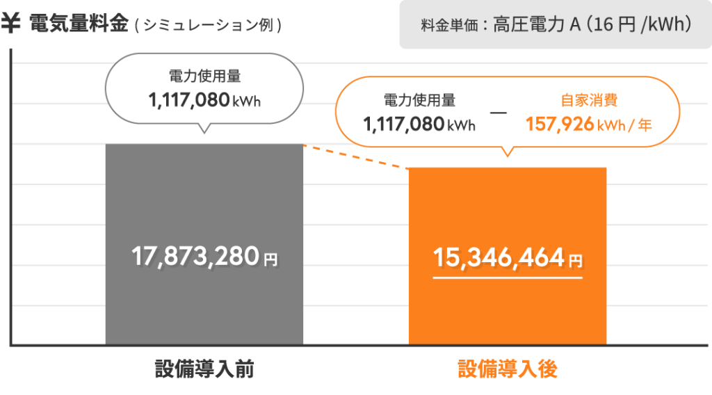 太陽光発電システムを導入することにより、通常使用する電気を自家発電で賄うことができます。自家で貯めた電気を自家で消費するため、電気にかかるコスト削減に繋がります。さらに、基本料金は「過去1年間で最も使用量が多かった時間帯の電力量(最大デマンド)」が計算の基準となり算出されているので、太陽光発電で自家消費することにより、最大デマンドが下がり、基本料金自体を下げることができます。